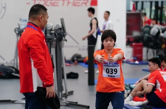 2023年12月29日,2023年國家隊(duì)冬訓(xùn)體能大比武在國家體育總局訓(xùn)練局舉行,來自射擊、舉重、田徑、游泳、跳水、花樣游泳、體操、蹦床、乒乓球、羽毛球等10支國家隊(duì)的150名運(yùn)動員參加活動。圖為國家跳水隊(duì)運(yùn)動員全紅嬋在測試前熱身。