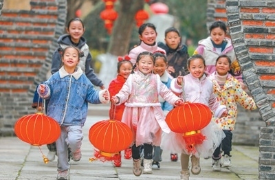 孩子們?cè)谳陡鄞逯信e著燈籠,歡快奔跑。陸志鵬攝(人民視覺(jué))