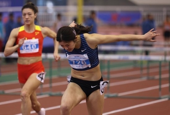 3月13日,四川隊(duì)選手吳艷妮(右)在女子60米欄決賽中沖刺撞線。新華社記者 廖宇杰 攝