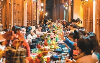 越南游客還品嘗了頗具特色的將軍府凱旋宴。40余張木桌沿街?jǐn)[放,熱氣騰騰的烏鎮(zhèn)特色土火鍋和各色菜品擺滿了桌面,耗兒魚(yú)、鮮菌菇拼盤(pán)、嫩滑牛肉等美食令人垂涎欲滴,越南游客圍坐在一起,享受美味盛宴。