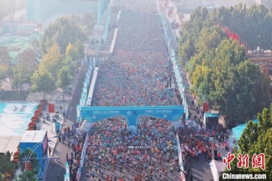 2023年10月15日,2023天津馬拉松鳴槍開跑,參加半馬的選手從起點出發(fā)。(無人機照片) 佟郁 攝