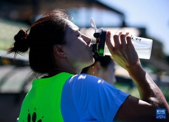 4月26日,中國(guó)女曲隊(duì)球員谷丙鳳在集訓(xùn)間隙補(bǔ)充水分。新華社記者 馬平 攝