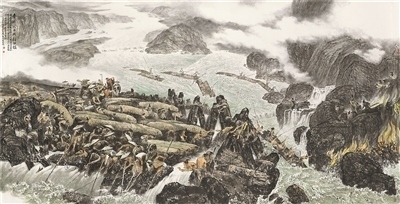 興修水利工程,在防汛抗旱的同時以囤水積水助力農(nóng)田灌溉,是綿延千年的治水智慧。中國古代水利工程中,都江堰水利工程尤具代表性。它是世界灌溉工程遺產(chǎn),也是當(dāng)今世界年代久遠(yuǎn)、唯一留存、以無壩引水為特征的宏大水利工程。中國畫名家宗其香于上世紀(jì)五六十年代繪制的《修筑都江堰》,便著重刻畫了戰(zhàn)國時期秦國蜀郡太守李冰親臨實(shí)地、督造江堤的場景,畫風(fēng)樸實(shí),歷史感撲面而來。入選“中華文明歷史題材美術(shù)創(chuàng)作工程”,由梁時民、李錛、張躍進(jìn)合作的中國畫《李冰父子與都江堰》,則以俯瞰視角展現(xiàn)了宏偉壯闊、蕩氣回腸的都江堰修建場面。畫面中,岷江洶涌,山石崢嶸;魚嘴筑堰,寶瓶分流;燒山碎石、河道清理、石料運(yùn)送等原屬不同時空的場景并置出現(xiàn),充滿浪漫主義色彩。這兩件畫作,將古人因勢利導(dǎo)改造水流的治水智慧具象化,充分彰顯都江堰讓成都平原由“澤國”變?yōu)椤疤旄畤钡臍v史意義。