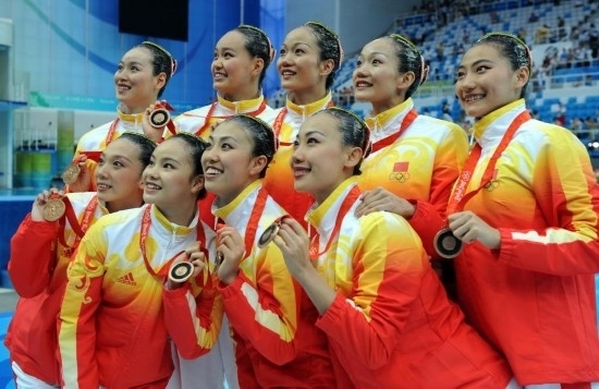 2008年8月23日,中國(guó)隊(duì)隊(duì)員在領(lǐng)獎(jiǎng)臺(tái)上展示獎(jiǎng)牌。當(dāng)日,在國(guó)家游泳中心——“水立方”舉行的北京奧運(yùn)會(huì)花樣游泳集體自由自選決賽中,中國(guó)隊(duì)以97.500分的總成績(jī)獲得該項(xiàng)目銅牌。新華社記者 王定昶 攝