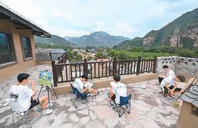在位于山西省左權(quán)縣澤城村的中國(guó)北方國(guó)際寫生基地澤城驛站內(nèi),山西工學(xué)院的學(xué)生們?cè)诋嫯?。新華社記者 楊晨光攝