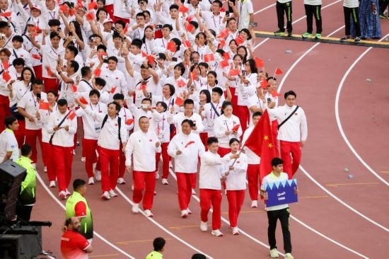11月4日,第十二屆全國(guó)少數(shù)民族傳統(tǒng)體育運(yùn)動(dòng)會(huì)志愿者在出征儀式上。新華社記者 楊冠宇 攝