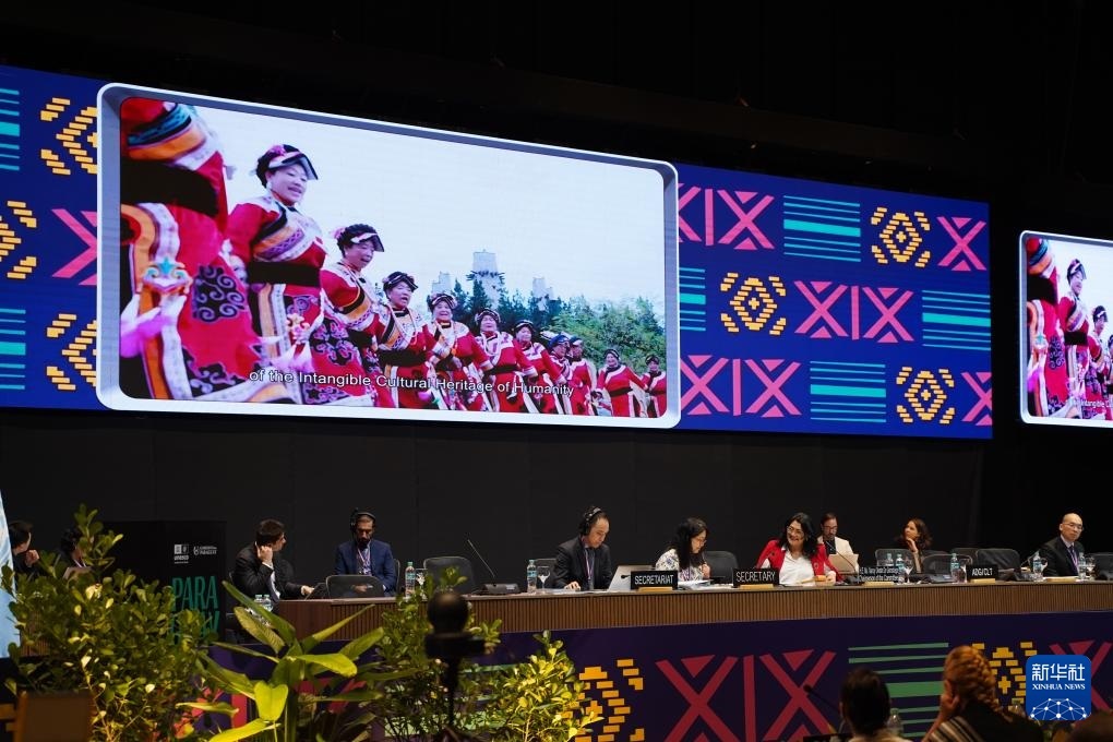 12月5日,在巴拉圭亞松森聯(lián)合國(guó)教科文組織保護(hù)非物質(zhì)文化遺產(chǎn)政府間委員會(huì)第19屆常會(huì)評(píng)審現(xiàn)場(chǎng),大屏幕播放“羌年”宣傳視頻。新華社記者 朱雨博 攝