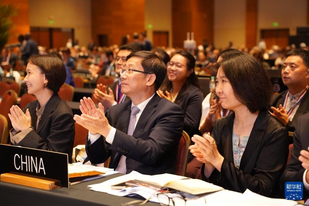 12月5日,在巴拉圭亞松森舉行的聯(lián)合國(guó)教科文組織保護(hù)非物質(zhì)文化遺產(chǎn)政府間委員會(huì)第19屆常會(huì)現(xiàn)場(chǎng),中國(guó)代表上臺(tái)領(lǐng)取證書。新華社記者 朱雨博 攝