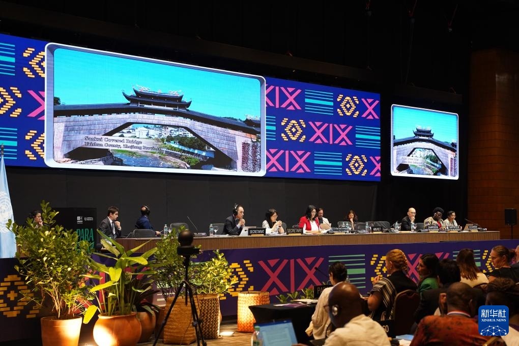12月5日,在巴拉圭亞松森聯(lián)合國(guó)教科文組織保護(hù)非物質(zhì)文化遺產(chǎn)政府間委員會(huì)第19屆常會(huì)評(píng)審現(xiàn)場(chǎng),大屏幕播放“中國(guó)木拱橋傳統(tǒng)營(yíng)造技藝”宣傳視頻。新華社記者 朱雨博 攝