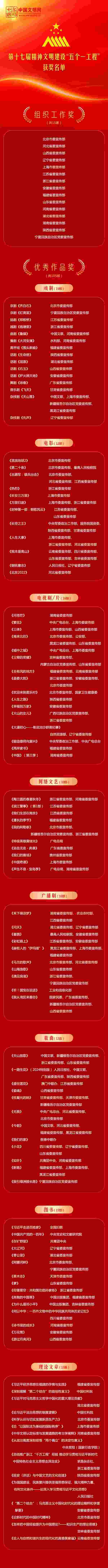 近日,中共中央宣傳部印發(fā)表彰決定,對第十七屆精神文明建設(shè)“五個一工程”組織工作先進(jìn)單位和優(yōu)秀作品進(jìn)行表彰。授予《齊白石》等15部戲劇作品、《流浪地球2》等12部電影作品、《問蒼?!返?6部電視作品、《陶三圓的春夏秋冬》等10部網(wǎng)絡(luò)文藝作品、《禾下乘涼夢》等10部廣播劇、《天山放歌》等12首歌曲,共105部作品“優(yōu)秀作品獎”;授予北京、河北、山西、遼寧、上海、江蘇、浙江、安徽、福建、山東、河南、湖北、湖南、陜西、寧夏等15個省區(qū)市黨委宣傳部“組織工作獎”。