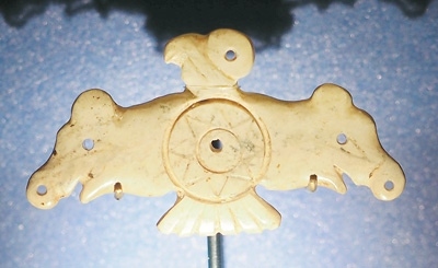 玉鷹是凌家灘文化最具代表性的器物之一。鷹側(cè)首傲視,雙翅張開,翅端各為一豬首形象,可能以豬作為財富的象征。鷹腹刻八角星紋,這種紋樣在凌家灘出土的玉版和新石器時代眾多陶器上都有出現(xiàn)。這件玉鷹可能是舉行祭祀儀式時所用之物,鷹、豬、八角星紋集于一器,體現(xiàn)了先民崇尚萬物有靈的宇宙觀。