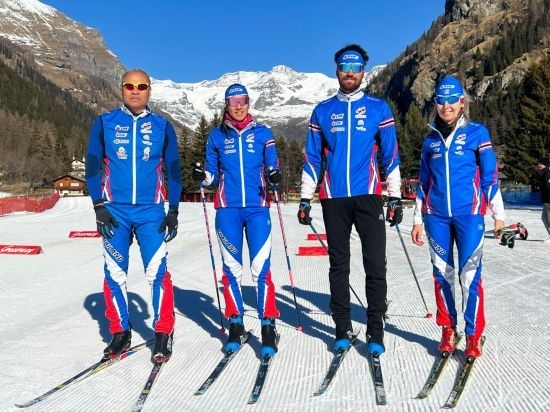 2022年1月24日,泰國越野滑雪隊運動員卡倫·尚?。ㄗ蠖ⅠR克·尚?。ㄗ笕┡c父母在歐洲備戰(zhàn)訓(xùn)練時合影。新華社發(fā)(受訪者供圖)