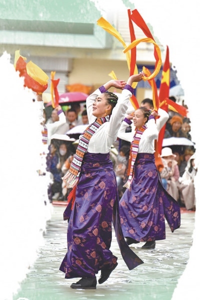 春節(jié)假期,每到傍晚時分,四川省阿壩藏族羌族自治州若爾蓋縣城中心的北上廣場都會準時響起歡快的鍋莊曲,遠道而來的游客與當地群眾一起跳起歡快的鍋莊。伴著音樂,鮮艷的長袖在風中劃出道道弧線,腰飾隨著舞步搖曳,男女老少圍成一圈、翩然起舞。