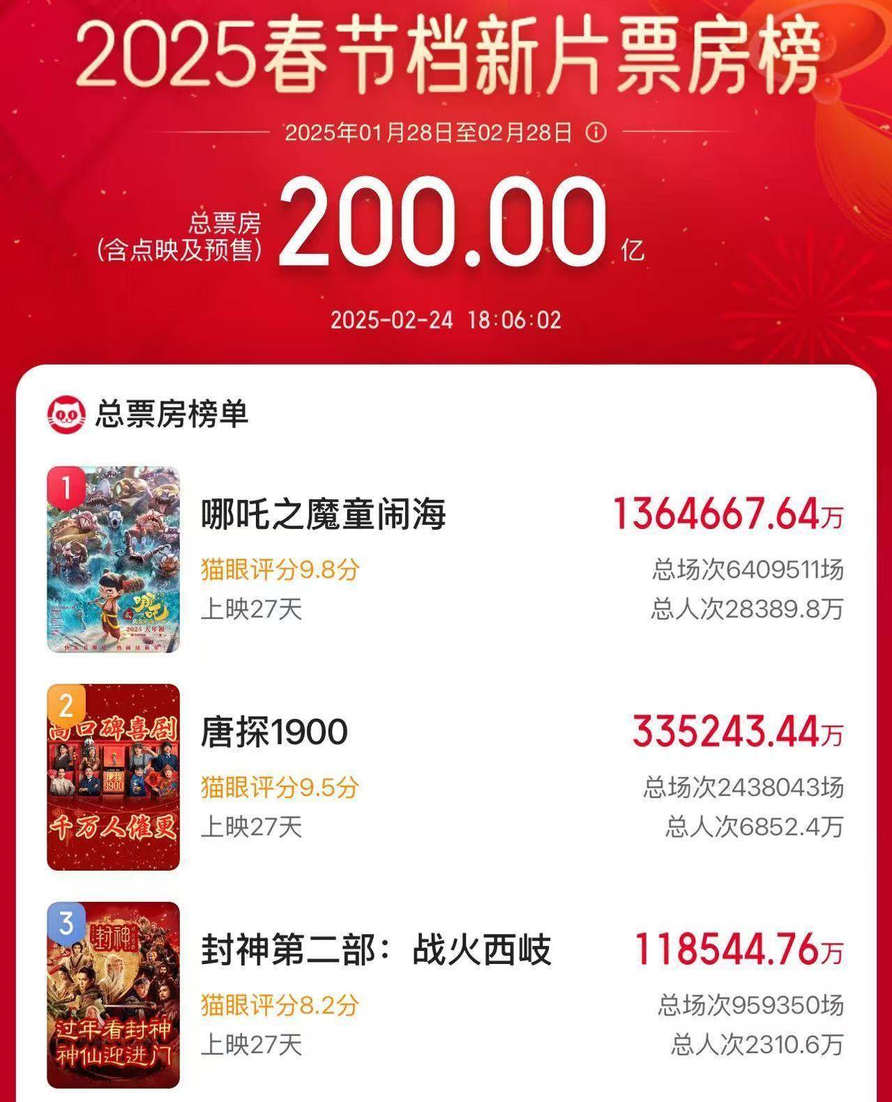2025春節(jié)檔上映新片總票房(含預(yù)售)