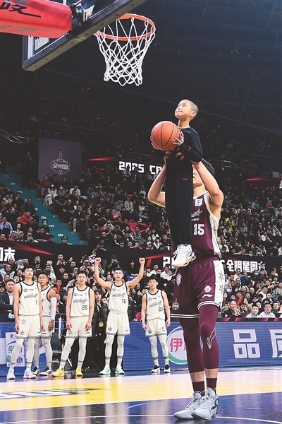 本屆全明星賽第二節(jié)最后的一次暫停時,現(xiàn)場上演了溫情一幕:北區(qū)明星隊首發(fā)中鋒楊瀚森,舉起來自吉林省孤兒學(xué)校的小朋友趙路健,幫助他完成了一次扣籃。