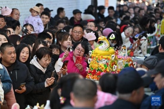 當(dāng)日是農(nóng)歷二月十九,每年農(nóng)歷這一天,呂梁山區(qū)的山西省嵐縣嵐城鎮(zhèn)的鄉(xiāng)親們都會(huì)將精心制作的面塑擺上街頭進(jìn)行展示,形成一條百米長的“面塑長河”。這些面塑作品造型各異、精巧絕倫,寄托了人們對(duì)美好生活的期盼。