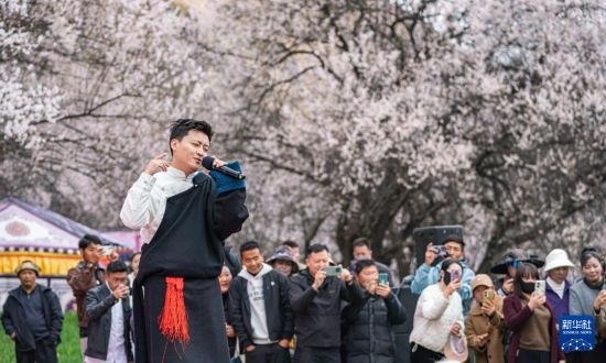 4月3日,歌手在林芝第二十二屆桃花旅游文化節(jié)巴宜區(qū)分會(huì)場(chǎng)現(xiàn)場(chǎng)演唱。
