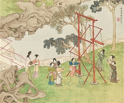 秋千,古稱“千秋”,可追溯至春秋時期,后改為“秋千”。據(jù)《荊楚歲時記》記載:“春時懸長繩于高木,士女衣彩服坐于其上而推引之,名曰打秋千?!痹诠糯?,清明節(jié)更是有著秋千節(jié)的別稱,可見古人對春日蕩秋千的喜愛。