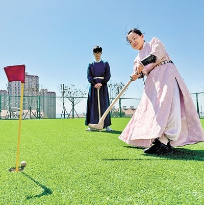 瞄球、揮擊,隨著一聲清脆的擊打聲,陶瓷小球劃出優(yōu)美的弧線,停到插有旗桿的“球窩”附近。春日遲遲,在河南省平頂山學(xué)院捶丸球場,一群學(xué)生身著漢服或運動服飾,借助形狀各異、長短不一的球杖,對草坪上的陶瓷球進行輪番擊打。