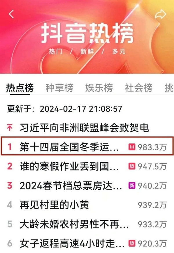 當(dāng)晚,無(wú)與倫比、震撼人心的開(kāi)幕式登上抖音熱榜第一名,截至18日中午,依然是熱榜前三名。