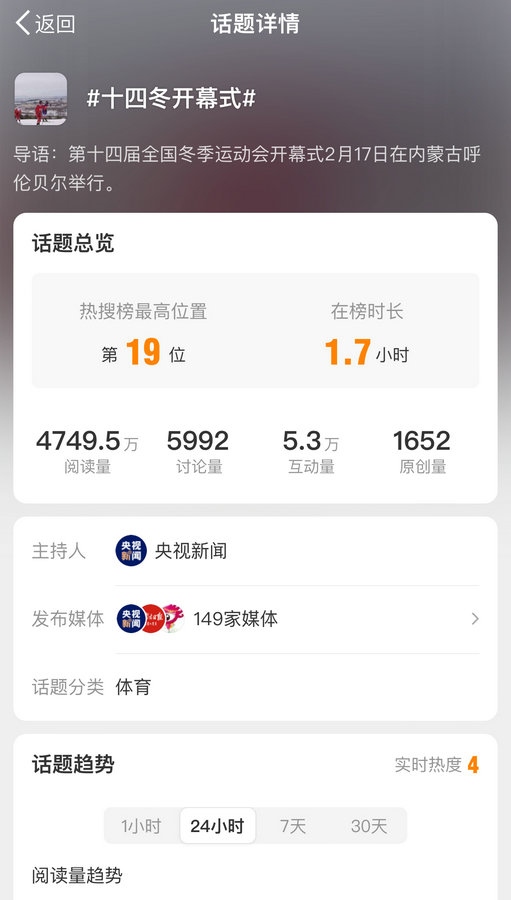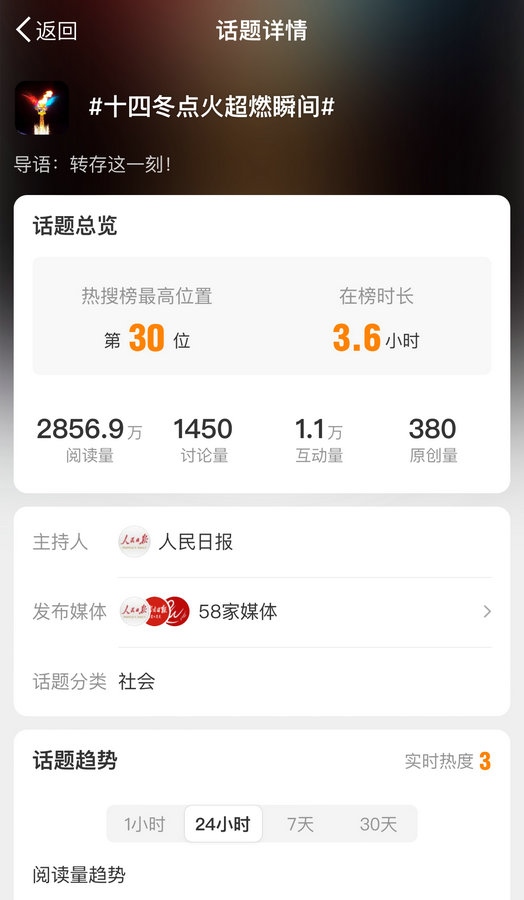 國(guó)內(nèi)多家主流媒體對(duì)開(kāi)幕式進(jìn)行報(bào)道,話題#十四冬開(kāi)幕式# #十四冬點(diǎn)火超燃瞬間#等話題登上微博熱搜榜,閱讀量近8000萬(wàn)。