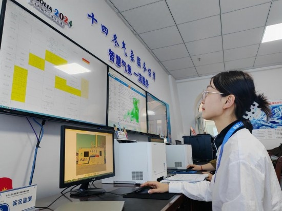 氣象服務團隊負責人王穎正在分析研判天氣情況。新華社記者 張武岳 攝