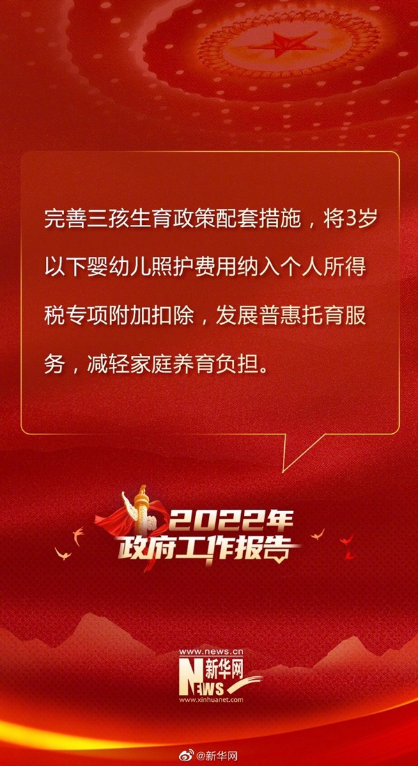 加強社會保障和服務(wù)。穩(wěn)步實施企業(yè)職工基本養(yǎng)老保險全國統(tǒng)籌,適當提高退休人員基本養(yǎng)老金和城鄉(xiāng)居民基礎(chǔ)養(yǎng)老金標準,確保按時足額發(fā)放。繼續(xù)規(guī)范發(fā)展第三支柱養(yǎng)老保險。加快推進工傷和失業(yè)保險省級統(tǒng)籌。做好軍人軍屬、退役軍人和其他優(yōu)撫對象優(yōu)待撫恤工作。積極應(yīng)對人口老齡化,優(yōu)化城鄉(xiāng)養(yǎng)老服務(wù)供給,支持社會力量提供日間照料、助餐助潔、康復(fù)護理等服務(wù),鼓勵發(fā)展農(nóng)村互助式養(yǎng)老服務(wù),推動老齡事業(yè)和產(chǎn)業(yè)高質(zhì)量發(fā)展。完善三孩生育政策配套措施,將3歲以下嬰幼兒照護費用納入個人所得稅專項附加扣除,發(fā)展普惠托育服務(wù),減輕家庭養(yǎng)育負擔。強化未成年人保護。提升殘疾預(yù)防和康復(fù)服務(wù)水平。加強民生兜底保障和遇困群眾救助,努力做到應(yīng)保盡保、應(yīng)助盡助。