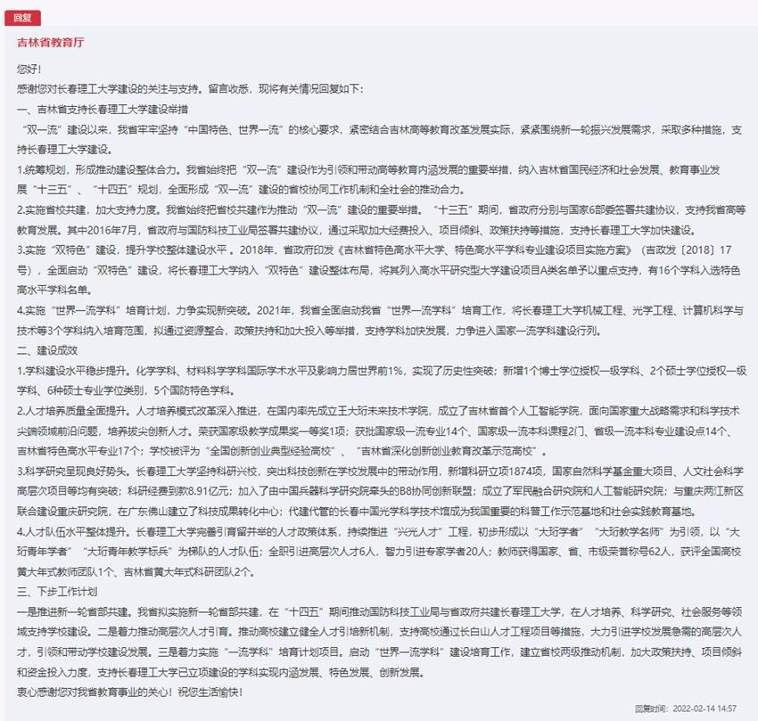 吉林省教育廳回復(fù)了網(wǎng)友的留言,并對(duì)吉林省高校建設(shè)工作進(jìn)行了詳細(xì)闡述。