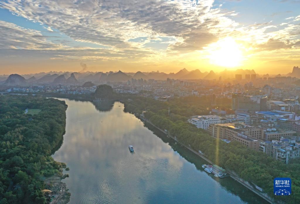 廣西桂林市城區(qū)漓江沿岸風(fēng)光(2021年11月24日攝,無(wú)人機(jī)照片)。新華社記者 周華 攝