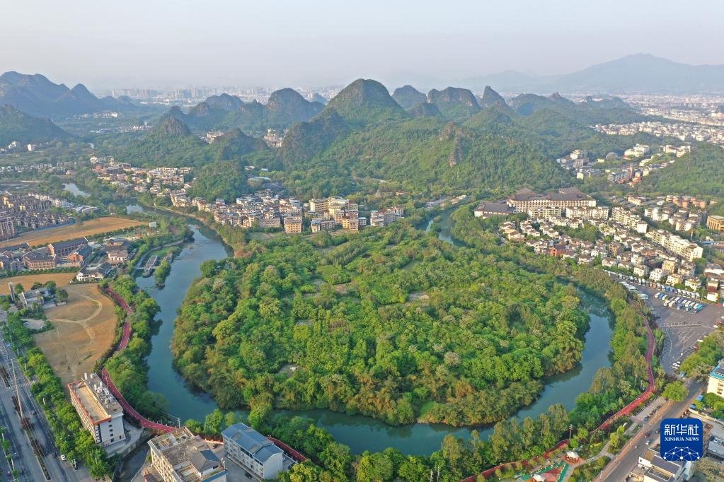 廣西桂林市城區(qū)風(fēng)光(4月10日攝,無(wú)人機(jī)照片)。新華社記者 周華 攝