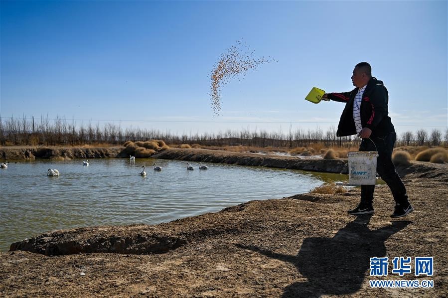 4月4日,烏梁素海濕地水禽自然保護(hù)區(qū)管理站工作人員岳建強(qiáng)給被救助的候鳥喂食。 -