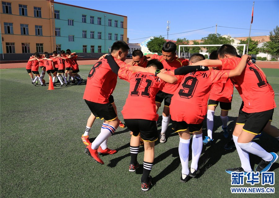 6月15日,內(nèi)蒙古自治區(qū)呼和浩特市托克托縣第二小學(xué)學(xué)生在足球課上進(jìn)行賽前熱身。新華網(wǎng)發(fā)(馬斌攝) 托克托縣第二小學(xué)是國(guó)家級(jí)校園足球特色學(xué)校,學(xué)校已在4—6年級(jí)開設(shè)了足球課。